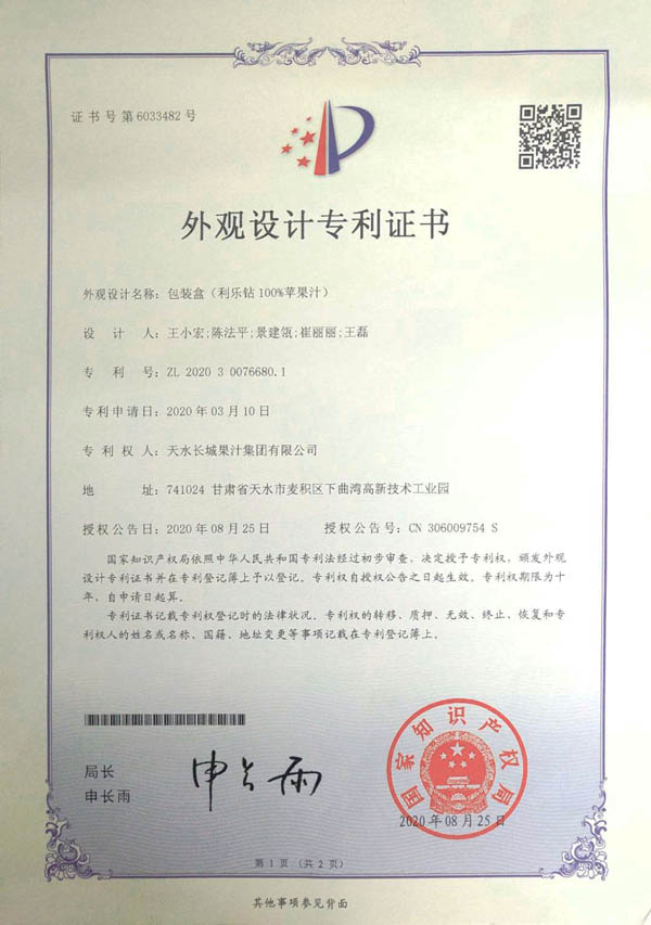 近日,公司取得由國家知識產(chǎn)權(quán)局頒發(fā)的兩項(xiàng)《外觀設(shè)計(jì)專利證書》,其專利名稱分別為包裝盒(利樂磚100%蘋果汁)、“包裝瓶(隴上花牛果糖液)”。外觀設(shè)計(jì)專利的取得有利于公司進(jìn)一步加強(qiáng)在相關(guān)應(yīng)用領(lǐng)域的市場競爭力,對公司未來發(fā)展將產(chǎn)生積極的作用。 |